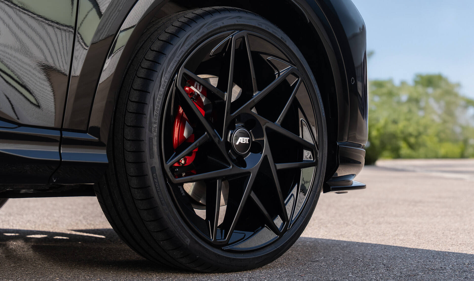 A central design and performance element is the 22-inch ABT EVO Sport wheels in glossy black, fitted with tires in the dimension 255/35 ZR22. They powerfully fill the wheel arches, enhance the sporty appearance, and contribute to precise handling thanks to their lightweight construction. The combination of lowering, large-format ABT EVO Sport wheels and aerodynamic components makes the ABT SQ5 an SUV with an exceptionally dynamic presence.